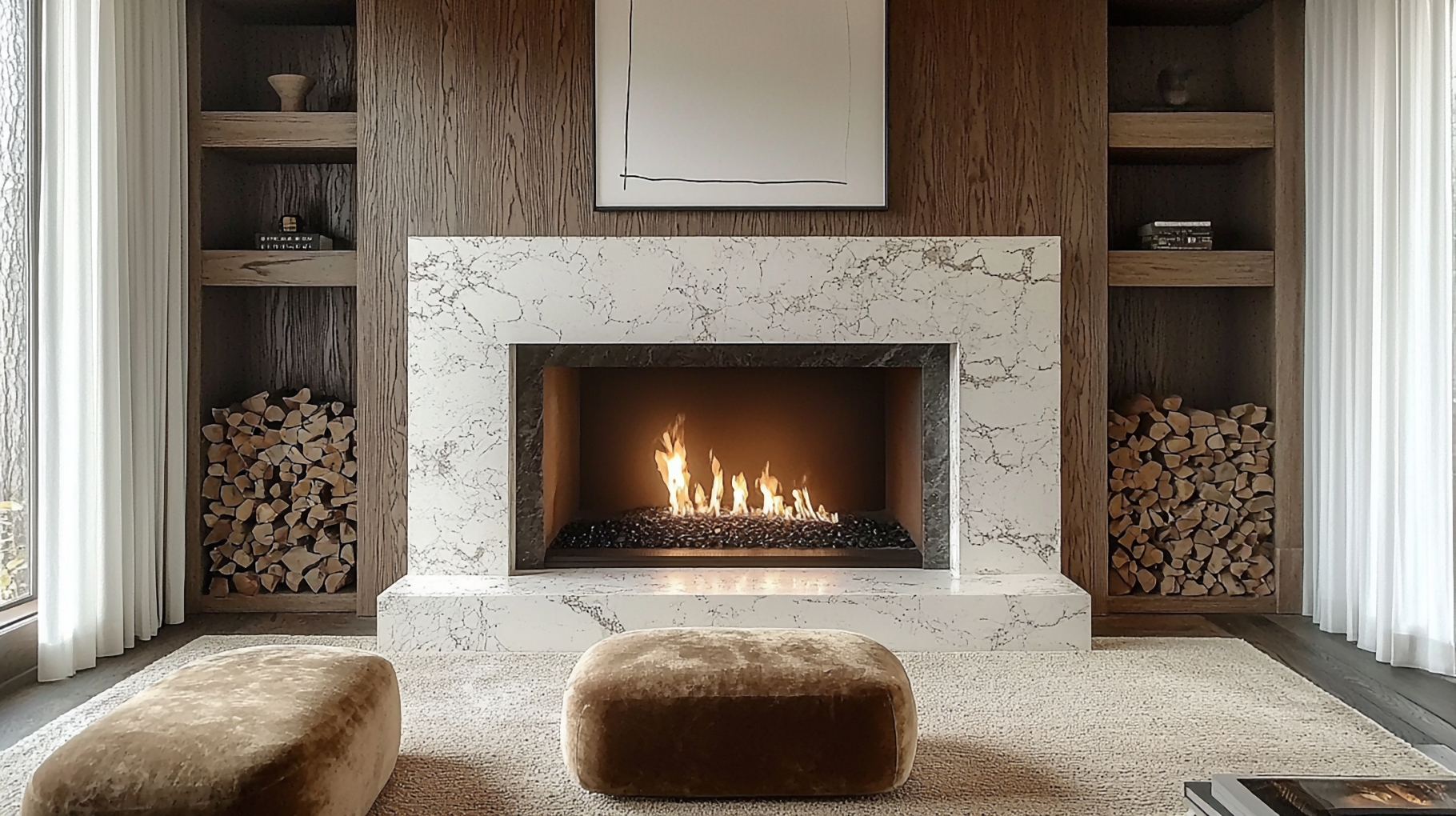 Crafted from solid natural marble, this fireplace exudes timeless sophistication with its striking veining and polished finish. Heat-resistant and durable, it serves as a majestic centerpiece for living rooms or grand halls, blending classic charm with modern functionality. Customizable in sizes and marble varieties like Calacatta or Nero Marquina.
